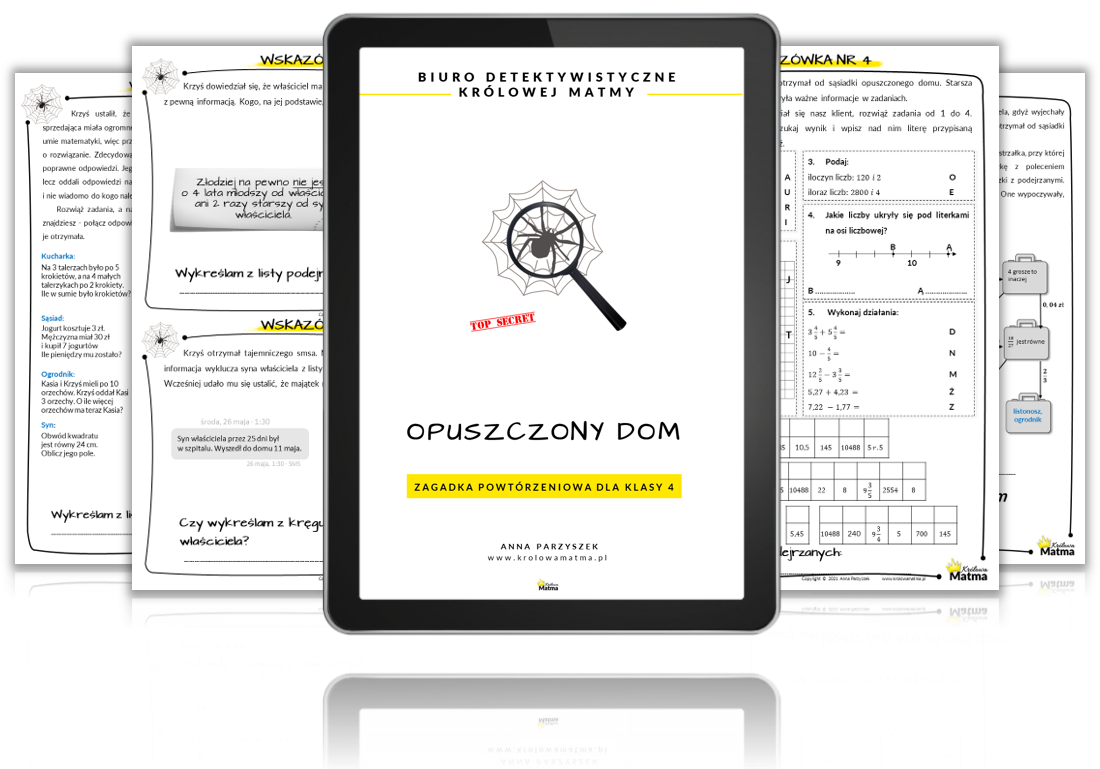 Chcesz poznać lepiej moje karty pracy? Pobierz darmową zagadkę detektywistyczną – powtórzenie ułamków zwykłych dla klasy 4: https://krolowamatma.pl/zagadkaulamki/