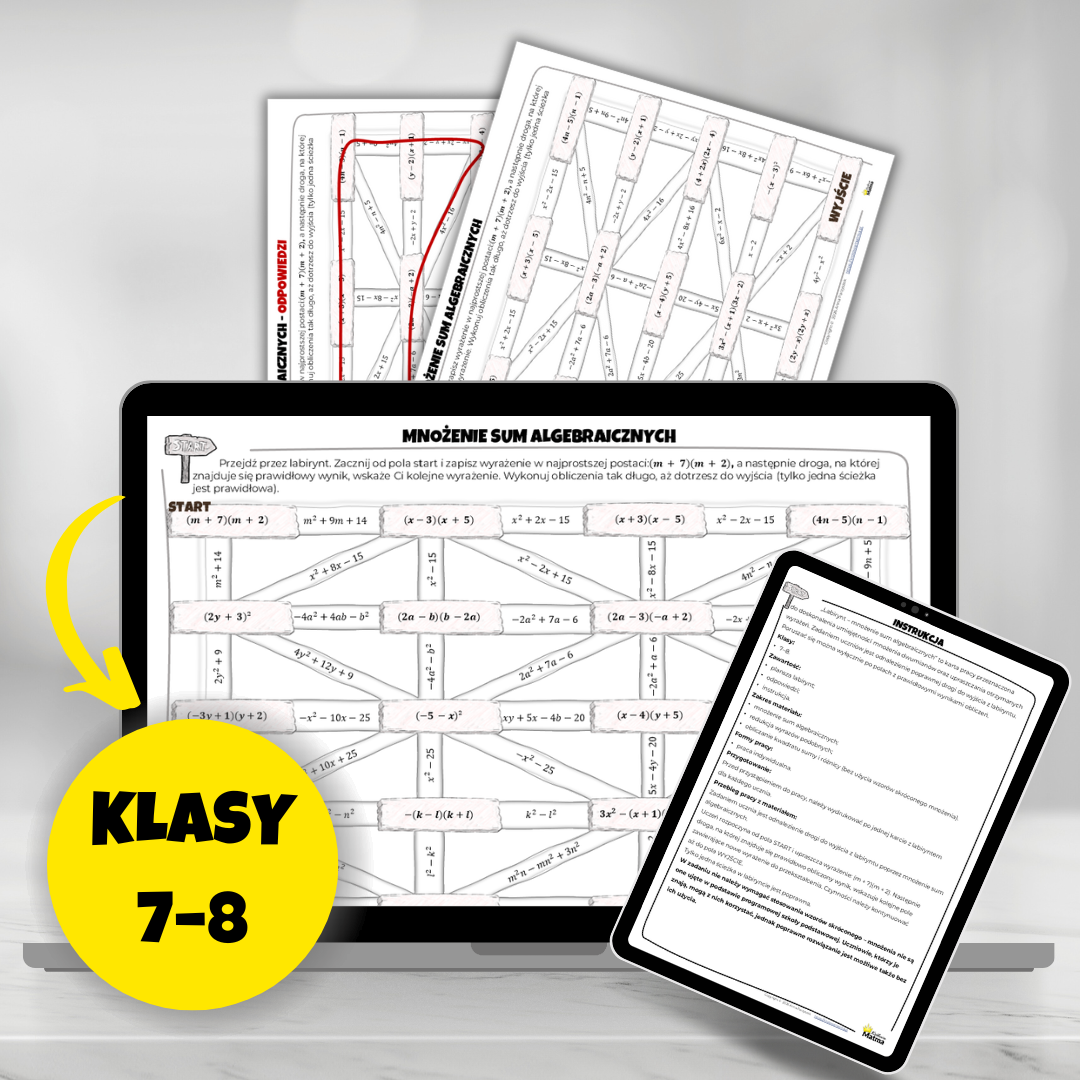 „Labirynt – mnożenie sum algebraicznych” to karta pracy przeznaczona do doskonalenia umiejętności mnożenia dwumianów oraz upraszczania otrzymanych wyrażeń. Zadaniem uczniów jest odnalezienie poprawnej drogi do wyjścia z labiryntu. Poruszać się można wyłącznie po polach z prawidłowymi wynikami obliczeń.