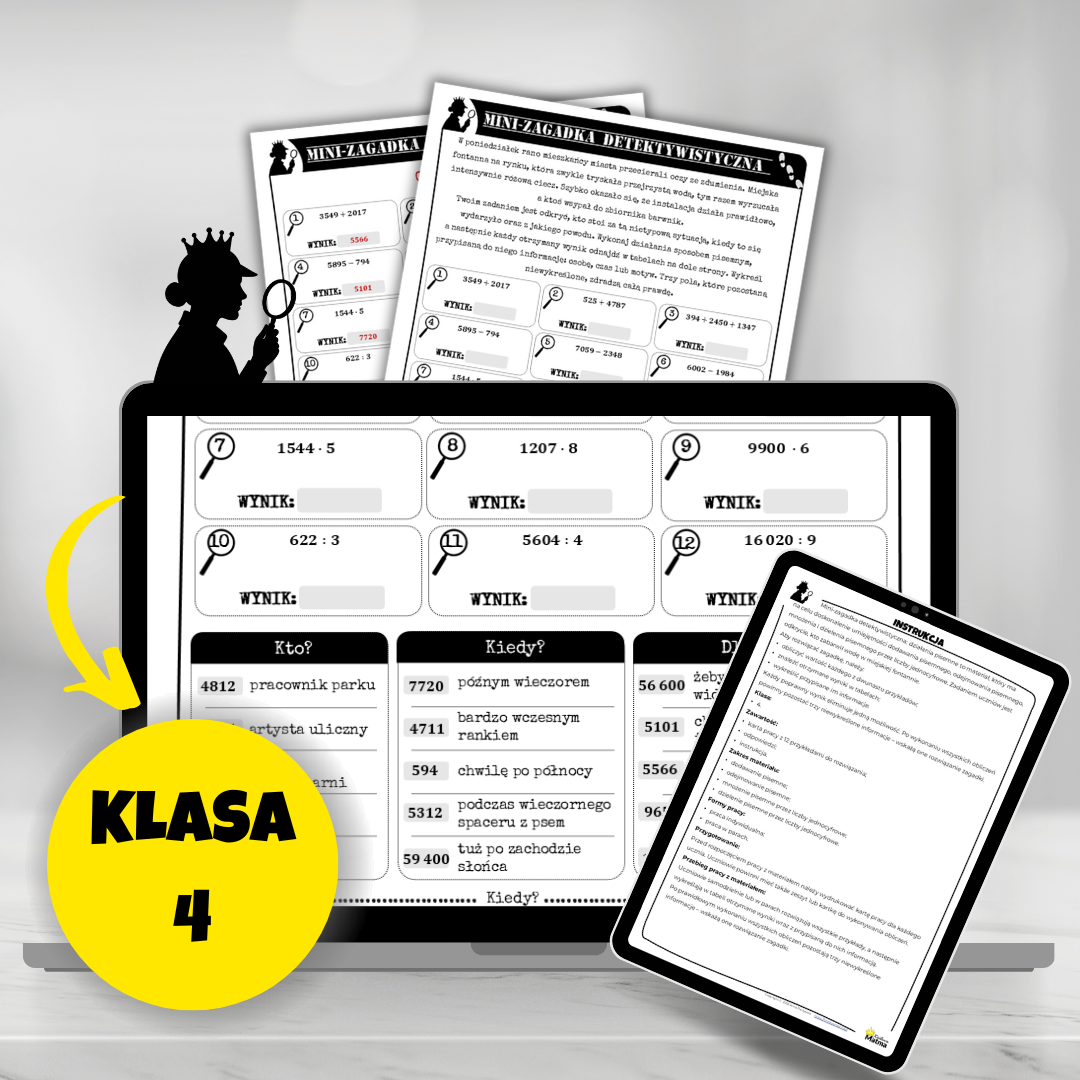Mini-zagadka detektywistyczna: działania pisemne to materiał, który ma na celu doskonalenie umiejętności dodawania pisemnego, odejmowania pisemnego, mnożenia i dzielenia pisemnego przez liczby jednocyfrowe. Zadaniem uczniów jest odkrycie, kto zabarwił wodę w miejskiej fontannie.