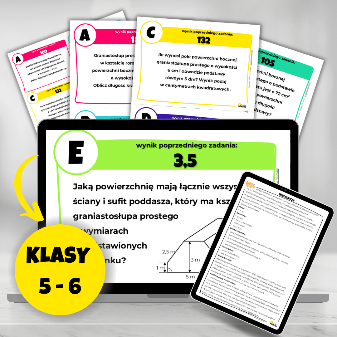 „Stacje zadaniowe – pole powierzchni graniastosłupa” składają się z ośmiu zadań tekstowych (otwartych) doskonalących umiejętność obliczania pól powierzchni graniastosłupów prostych. Zadania te mogą być wykorzystane zarówno do pracy indywidualnej, jak i grupowej. Praca z materiałem polega na rozwiązaniu dowolnego zadania, znalezieniu do niego odpowiedzi, a następnie rozwiązaniu zadania z kartki, na której ta odpowiedź się znajduje. Proces ten trwa tak długo, aż wszystkie zadania zostaną wykorzystane.