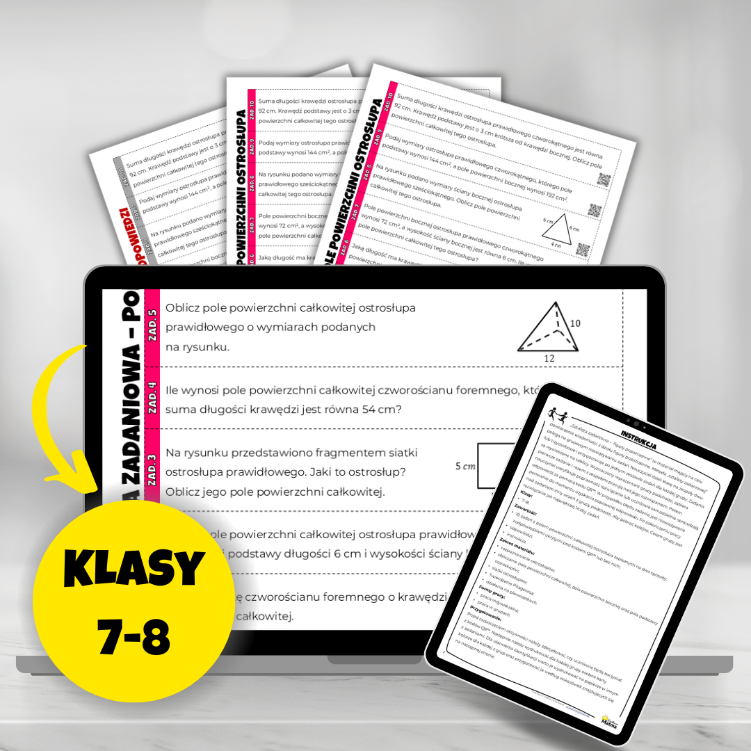 - 10 zadań z polem powierzchni całkowitej ostrosłupa zapisanych na dwa sposoby: z odpowiedziami ukrytymi pod kodami QR™ lub bez nich;