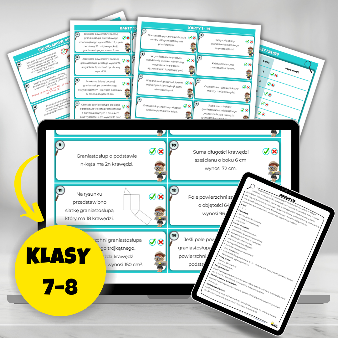 „Tropiciele prawdy – własności graniastosłupów” to zadanie, w którym   uczniowie analizują stwierdzenia zapisane na kartach i określają, które z nich są prawdziwe. Fałszywe zdania poprawiają, zmieniając jeden wyraz lub jedną liczbę, aby uczynić je poprawnymi. W razie potrzeby dostosowują również formę gramatyczną pozostałych wyrazów w zdaniu. Materiał pomaga utrwalić wiedzę na temat graniastosłupów oraz rozwija umiejętność krytycznego myślenia.