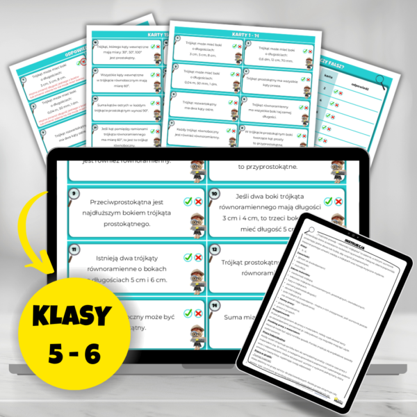 „Tropiciele prawdy – własności trójkątów” to zadanie, w którym uczniowie analizują stwierdzenia zapisane na kartach, określając, które z nich są prawdziwe. Fałszywe zdania poprawiają, zmieniając jedno słowo lub jedną liczbę, aby uczynić je poprawnymi. W razie potrzeby dostosowują również formę gramatyczną pozostałych wyrazów w zdaniu. Materiał pomaga utrwalić wiedzę na temat czworokątów oraz rozwija umiejętność krytycznego myślenia.