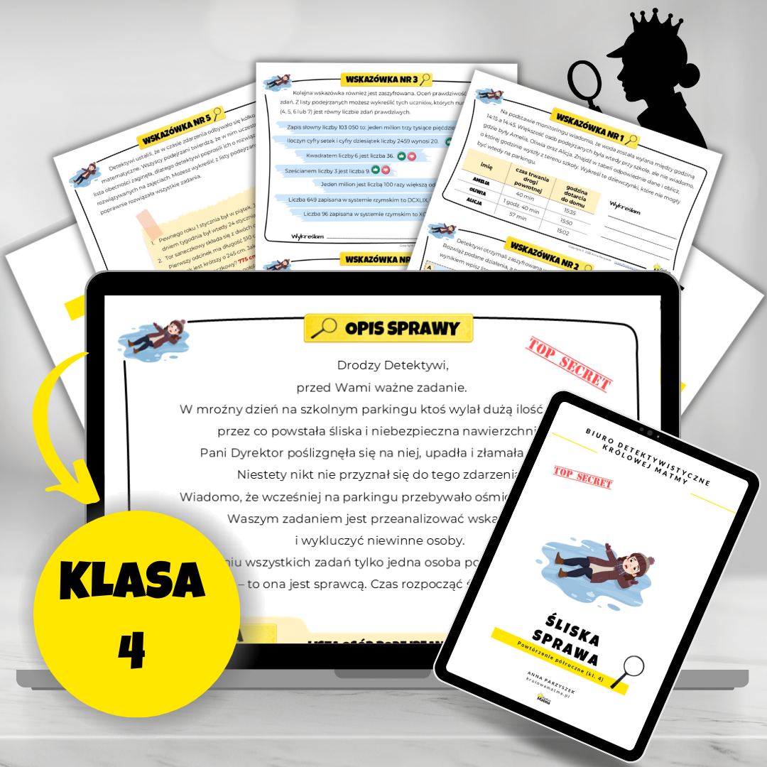 W zagadce „Śliska sprawa” uczniowie wcielają się w rolę detektywów, którzy muszą ustalić, kto wylał wodę na szkolnym parkingu, doprowadzając do powstania niebezpiecznie śliskiej nawierzchni oraz wypadku pani dyrektor. Aby rozwiązać sprawę, uczniowie analizują kolejne wskazówki, rozwiązują zadania matematyczne i na tej podstawie wykreślają niewinne osoby z listy podejrzanych. Zabawa kończy się w momencie, gdy na liście pozostanie tylko jedna osoba – to ona jest sprawcą zdarzenia.